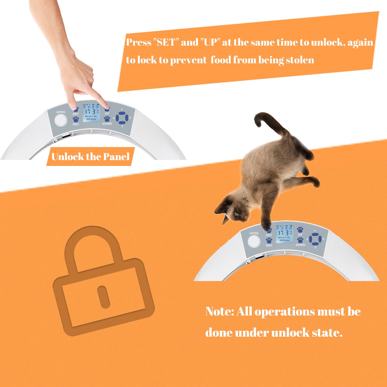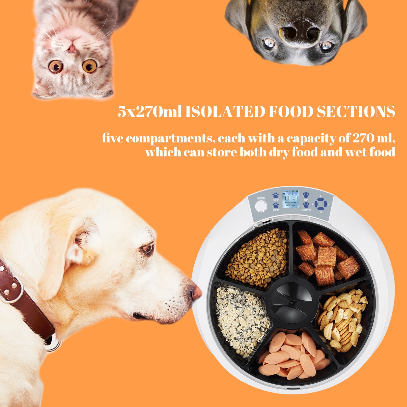 [5x270ml ISOLATED FOOD SECTIONS]The automatic pet food dispenser is made of ABS material, with five compartments, each with a capacity of 270 ml, which can store both dry food and wet food. It will serve up to 5 meals, one initial feed and four further timed feeds. Can make your pet feeding more convenient.