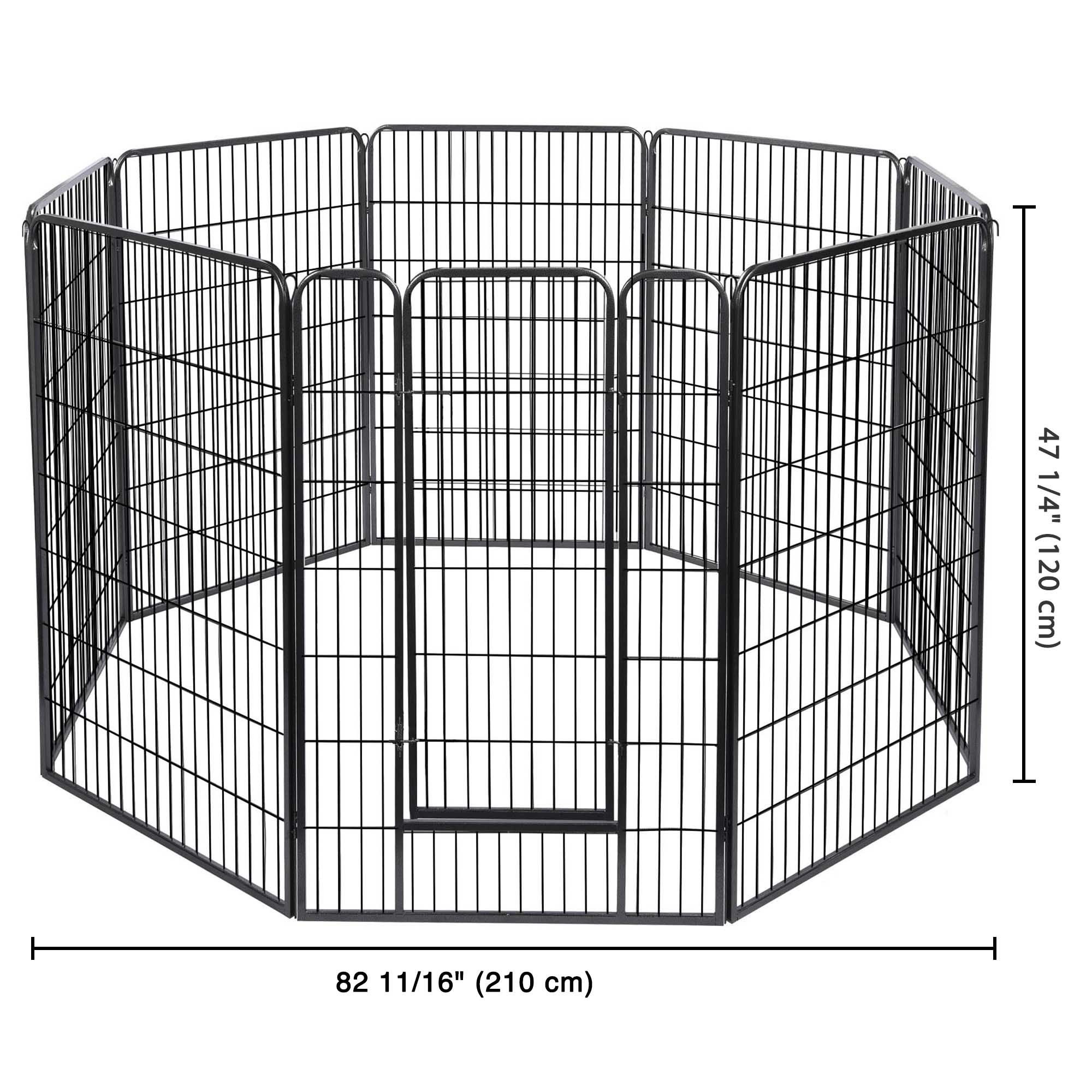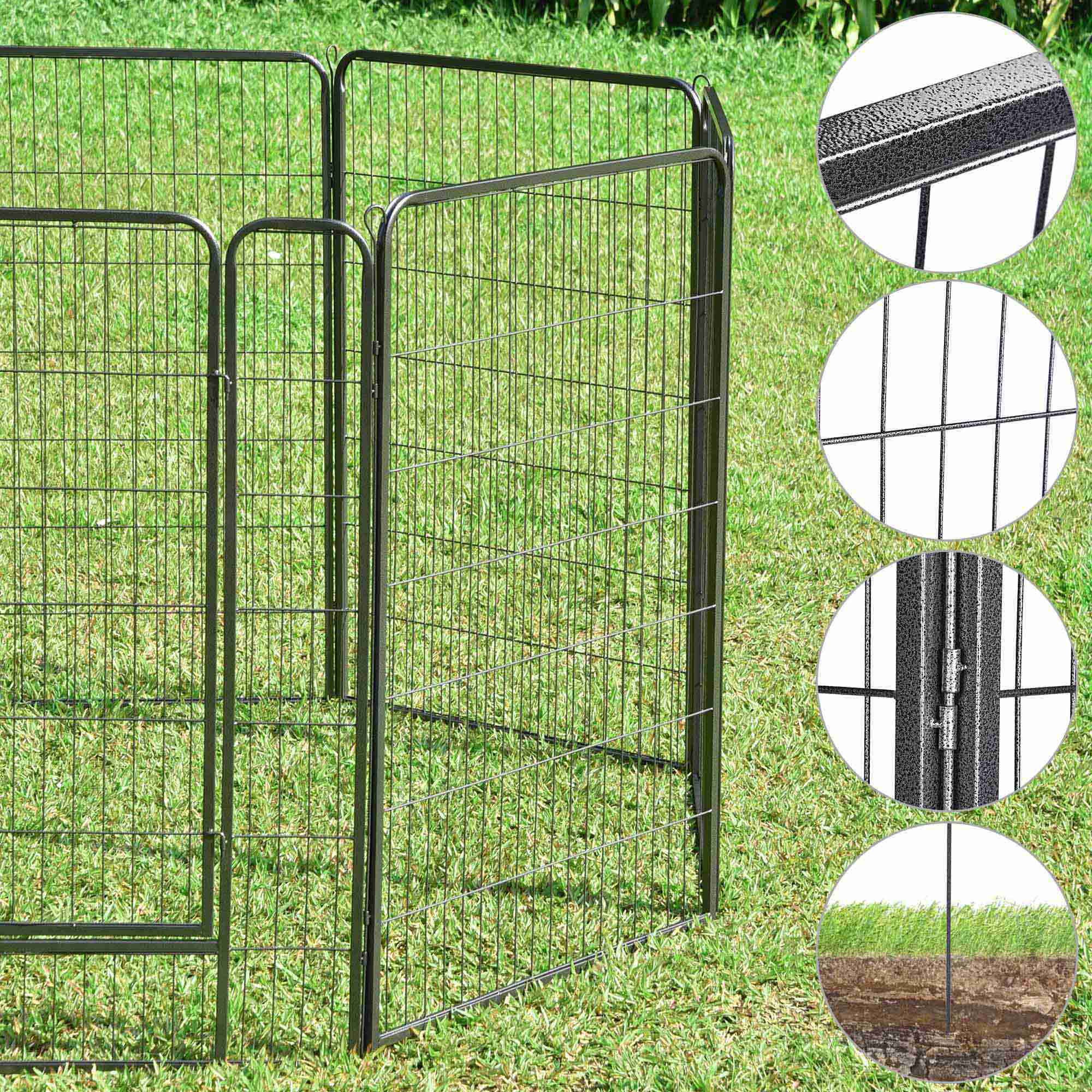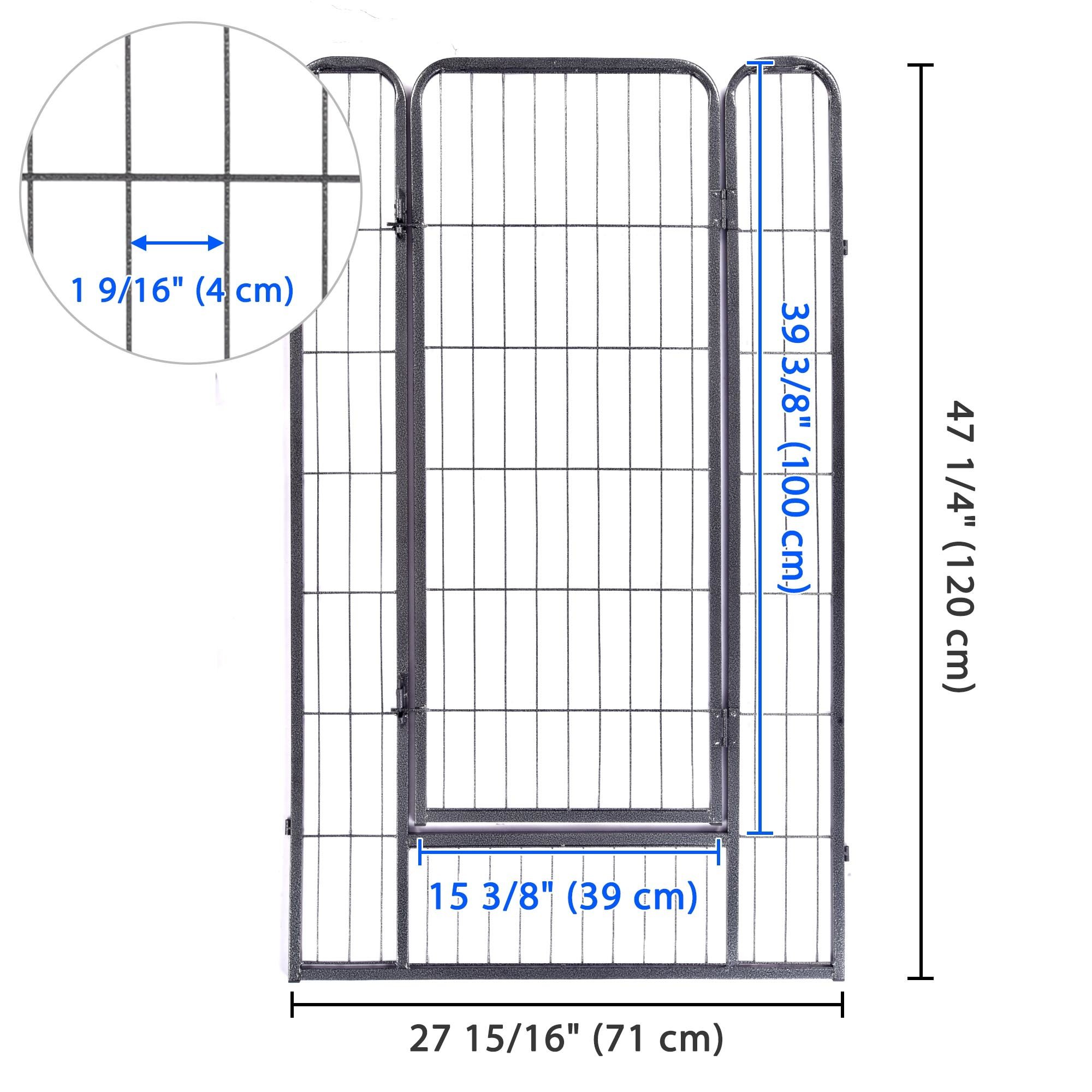- Rust-resistant & Sturdy Fence - 8 pieces 28"Wx47"H Pet Playpen Panel is made of powder coated metal for great rust resistance, and keeping panel sleek and beautiful; 0.6"x0.6" square tube guarantees rigidity to withstand the weight of pet, ground stakes for firmly fixating the panels on the ground in outdoor space