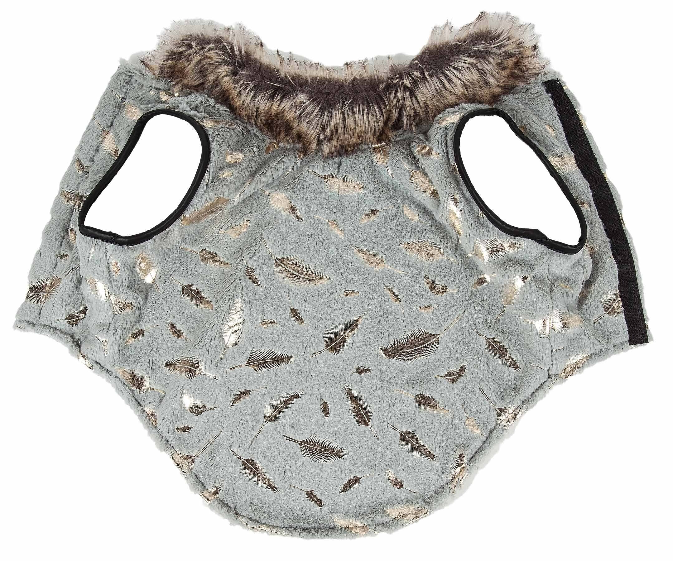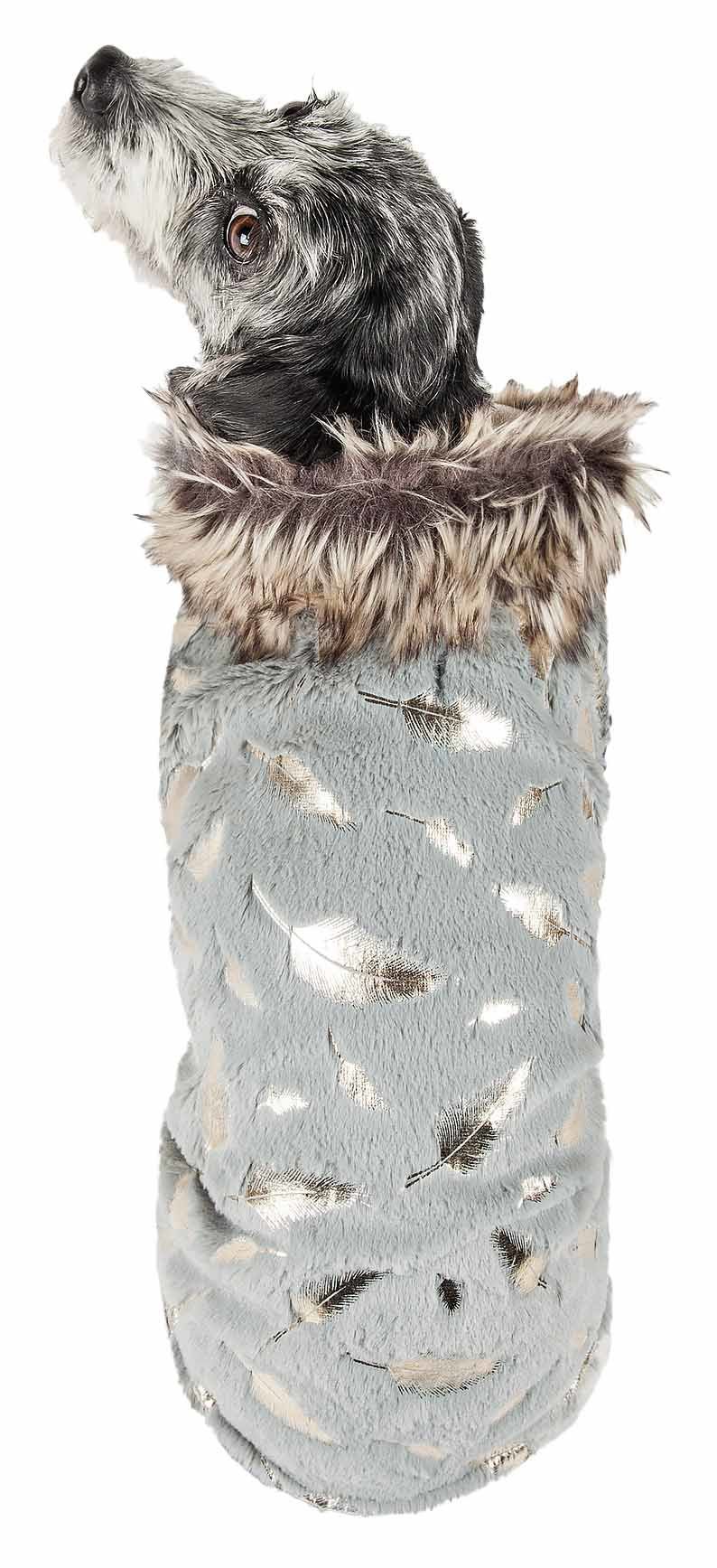 The Pet Life LUXE 'Gold Wagger' Gold-Leaf Designer Fur Dog Coat features an Extravagant Gold Leaf Pattern along the back side embedded on an Buttery-Soft Faux-Fur solid Grey exo-shell and the Reverse is lined with Sherpa for added comfortability and warmth that gently hugs the body. Features Sponged sided lining for superior craftsmanship and durability by the sleeve areas with an Accented Trendy Faux-Fur Collar. Features Tough-Grade Velcro Belly Enclosures for convenient on and off access and a leash slit below the Neck line. This jacket is part of our Pet Life Luxury collection. Available in Multiple Sizes.