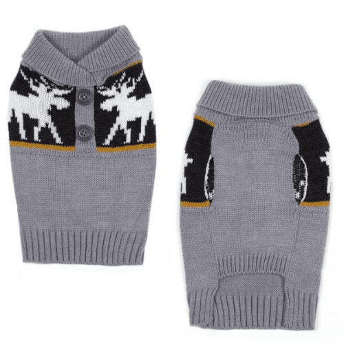 This fashionable two-button shawl collar sweater, adorned with a woodsy moose-print band, keeps dogs comfortably, stylishly warm in chilly fall and winter weather.
