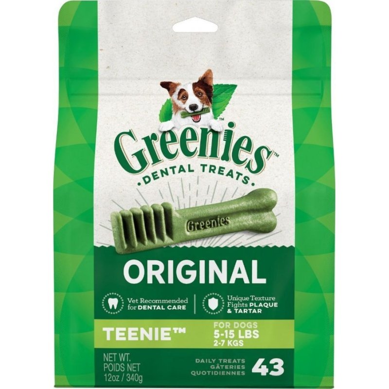 Greenies Teenie Dental Dog Treats are the Original Smart Treat! These delicious, safe and effective dental treats fight plaque and tartar buildup, maintain healthy teeth and gums, and provide fresh breath. With low fat and complete nutrition, they're great for daily feeding.
