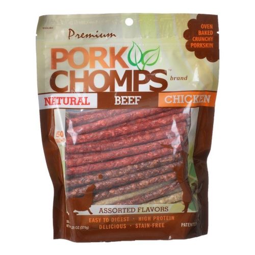 Premium Pork Chomps Assorted Munchy Sticks are the rawhide-free solution to your dogs urge to chew. Made of oven-roasted porkskin, these crunchy, long-lasting chews are easy to digest, high in protein, and non-staining.