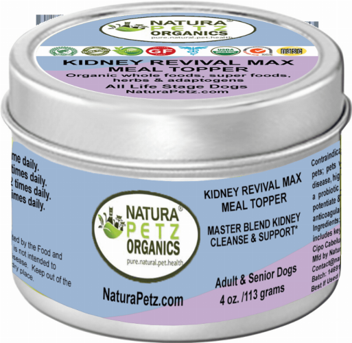 KIDNEY REVIVAL MAX Meal Topper for Adult and Senior Cats and Dogs* is a potent antioxidant and kidney nutritional adaptogen support, which may help support phytochemically and nutritionally healthy kidney function, may help support healthy kidney cells and organ functionality, may help limit toxin load on the kidneys, may help support waste elimination produced by kidneys, and may help detoxify the liver and kidneys by promoting bile production and inhibiting bacteria and fungi.